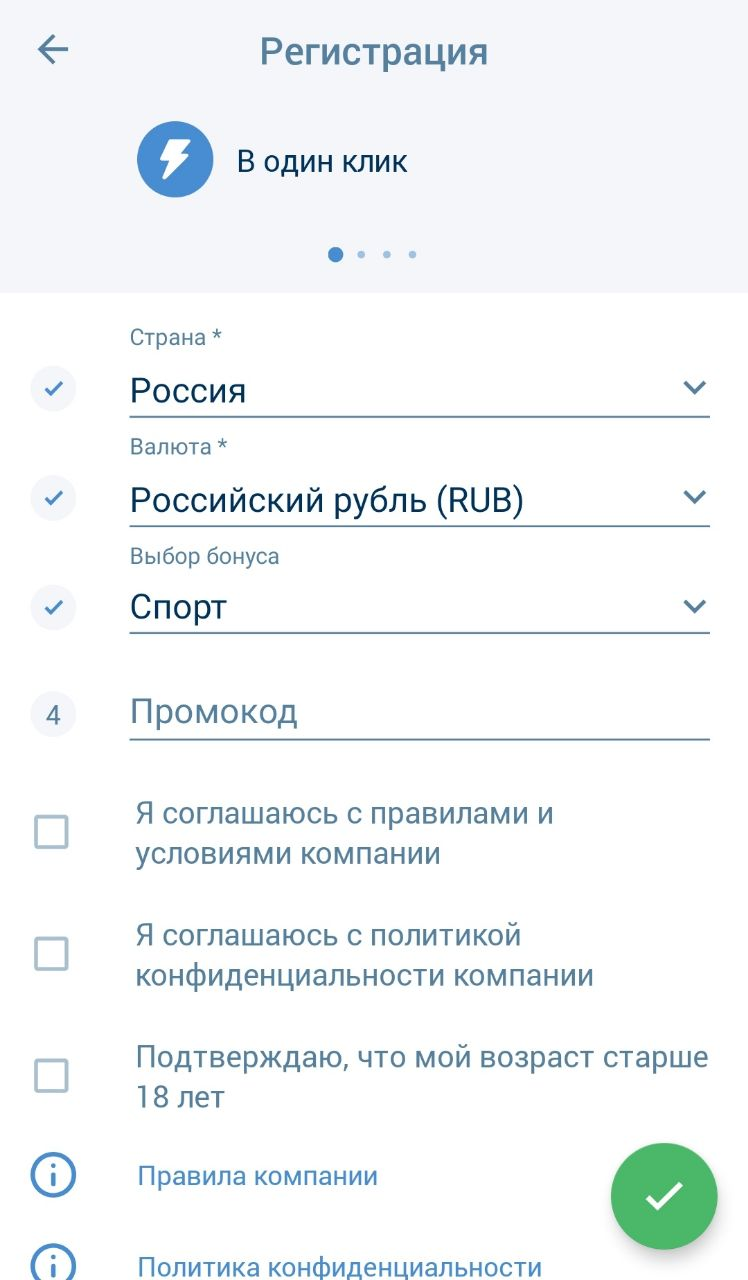 Сразу можно выбрать тип приветственного бонуса – на ставки или в казино. Активируйте промокод, если есть. К сожалению, специального бонуса за скачивания мобильного приложения нет. Но игроки получают доступ ко всем акциям букмекерской конторы.